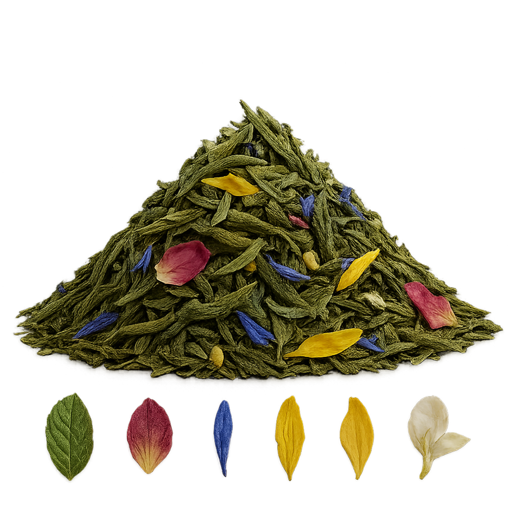 Grüntee, Rosenblüten, Kornblumenblüten, Sonnenblumenblüten, Jasminblüten, Aroma