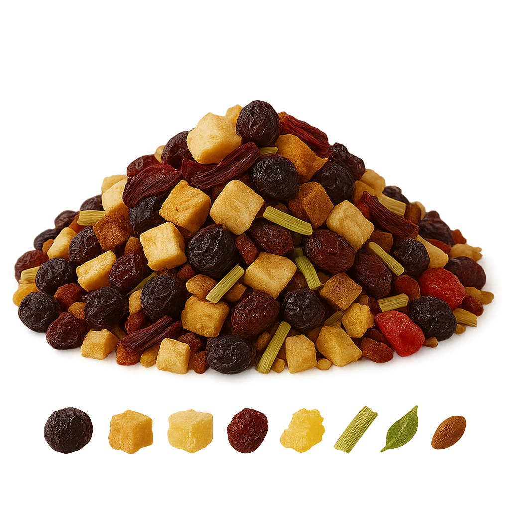 Korinthen( Korinthen, Sonnenblumenöl), Apfelstücke, Ananasstücke (Ananas, Zucker), Weinbeeren, Lemongras, Zitronenfuchtgranulat, Erdbeerstücke, Aroma