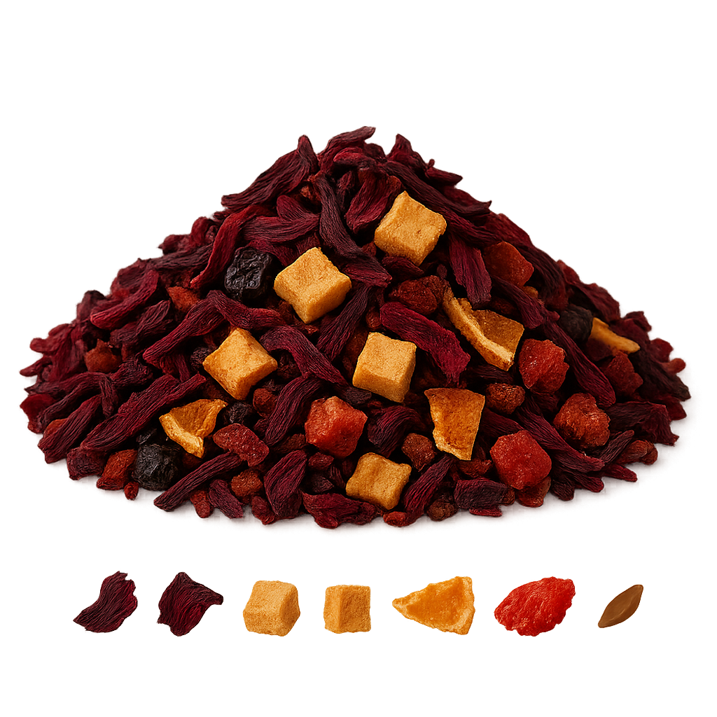 Hibiskusblüten, Hagebuttenschalen, Apfelstücke, Orangenschalen, Erdbeerstücke, Aroma