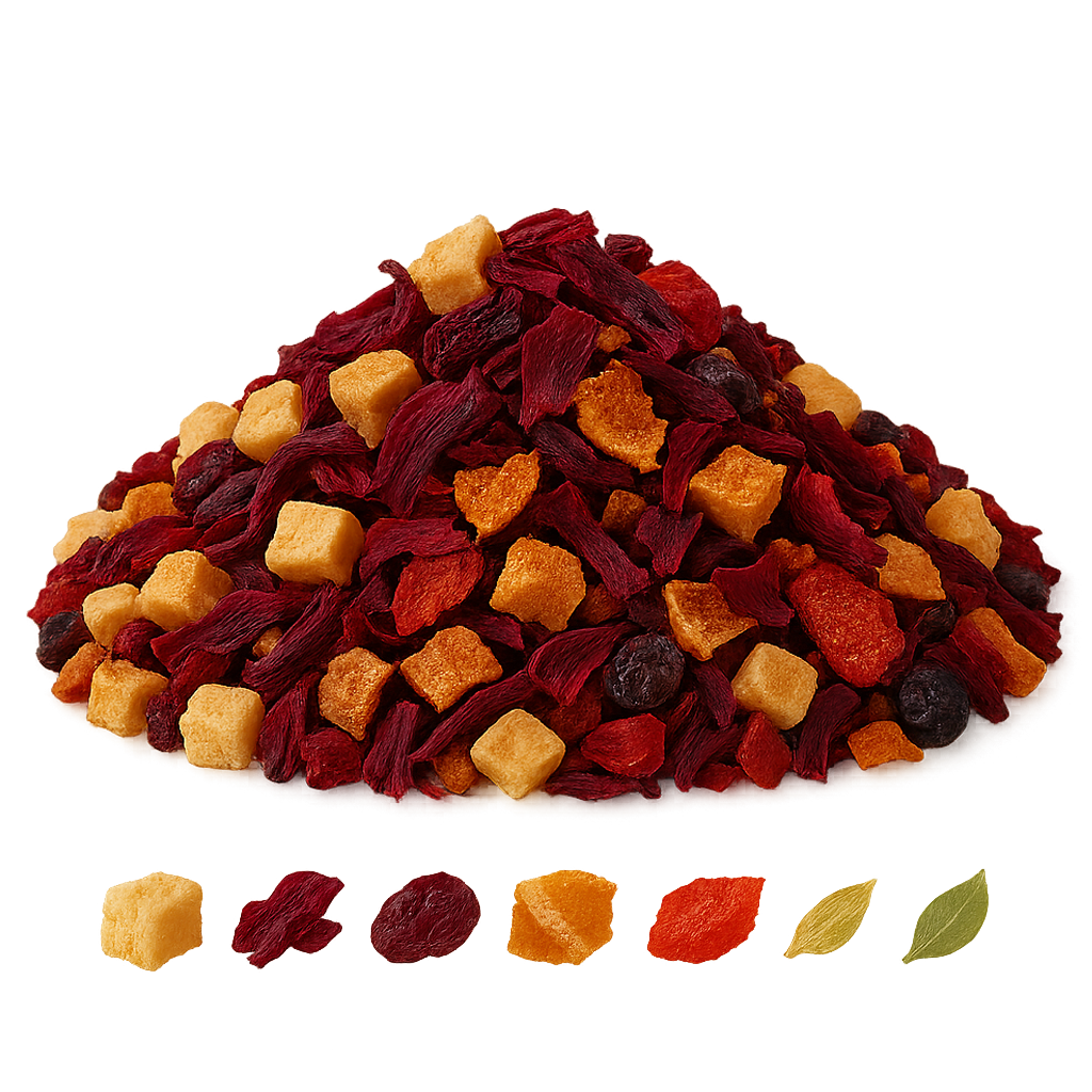Apfel, Hibiskus, Hagebuttenschalen, Orangenschalen, Erdbeerstücke, Aroma