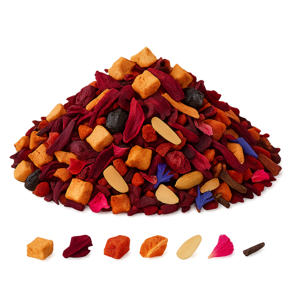 Apfelstücke, Hibiskus, Hagebuttenschalen, Orangenschalen, gehobelte Mandeln, Aroma, Rosenblüten, Kornblumenblüten, Nelken, Kardamom, Vanillestücke