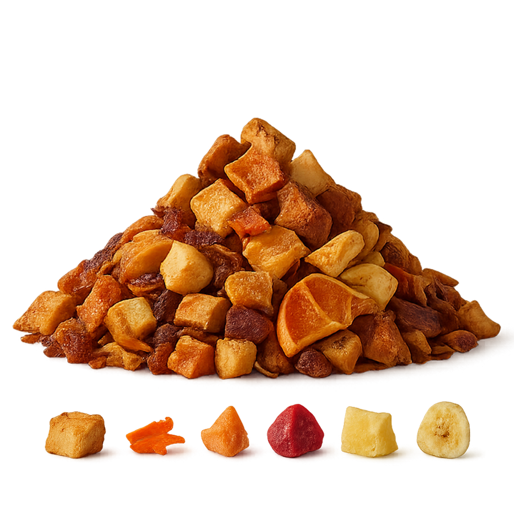 Apfelstücke, Karottenflocken, Pfrisichstücke( Pfirsich, Konservierungstoff: Schwefeloxid), Rote-Beete-Stücke, Ananasstücke (Ananas, Zucker, Zitronensäure), Bananenchips (Bananen, Kokosöl, Rohrzucker), Orangenschalen, Aroma, Rosenblütenblätter, Papayastücke(Papaya, Zucker), Vanillestücke