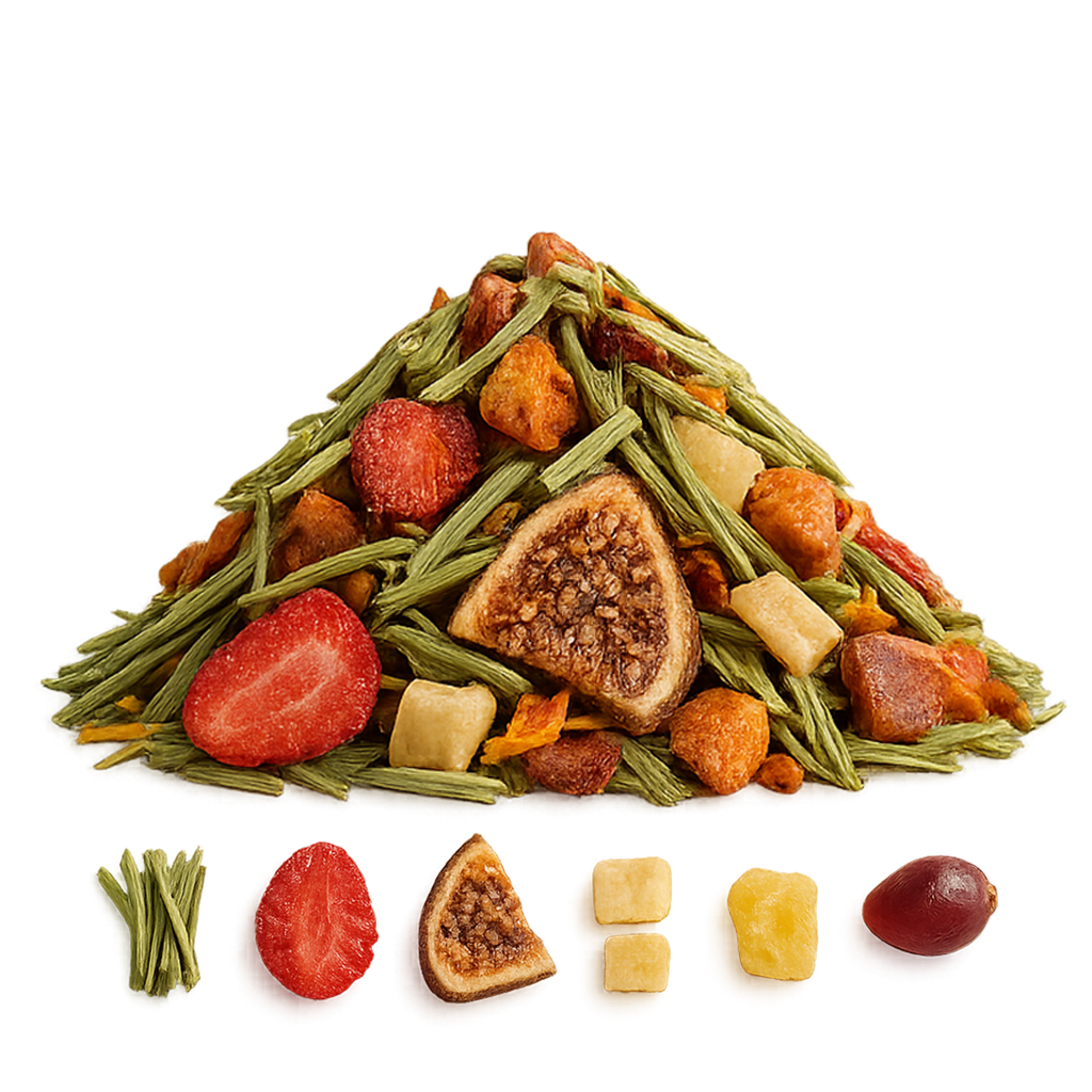Lemongras, Erdbeerscheiben, Feigenscheiben, Apfelstücke, Ananasstücke(Ananas, Zucker, Zitronensäure), Papapya(Papaya, Zucker), Hibiskus geschn., Pfefferminzblätter, Ringelblumenblätter, Kornblumenblüten, Jasminblüten, Rosenblütenblätter, Aroma