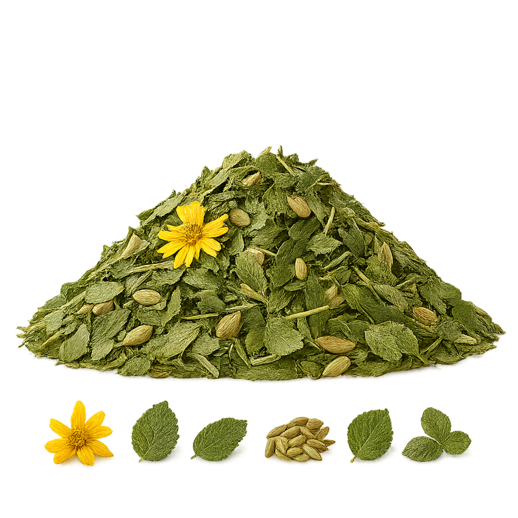 Brombeerblätter, Anissamen, Fenchelsamen, Himbeerblätter, Erdbeerblätter, Hagebuttenschalen, Hasselnussblätter, Sonnenblumenblüten, Spitzwegerich, Rosenblüten, Apfelstücke, Attichbeeren, Melisseblätter, Pfefferminze, Aroma