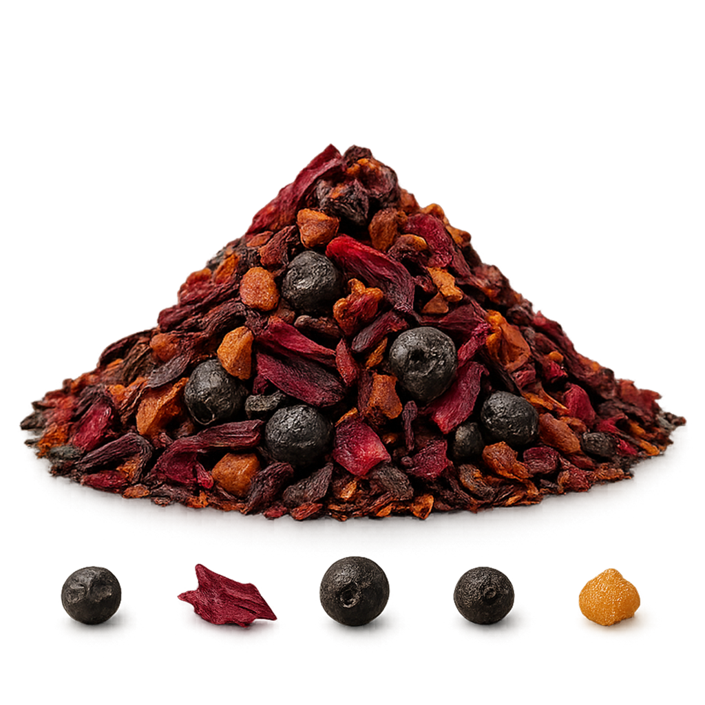Korinthen (Korinthen, Sonnenblumenöl), Hibiskus, Holunderbeeren, Buchweizen, Aroma